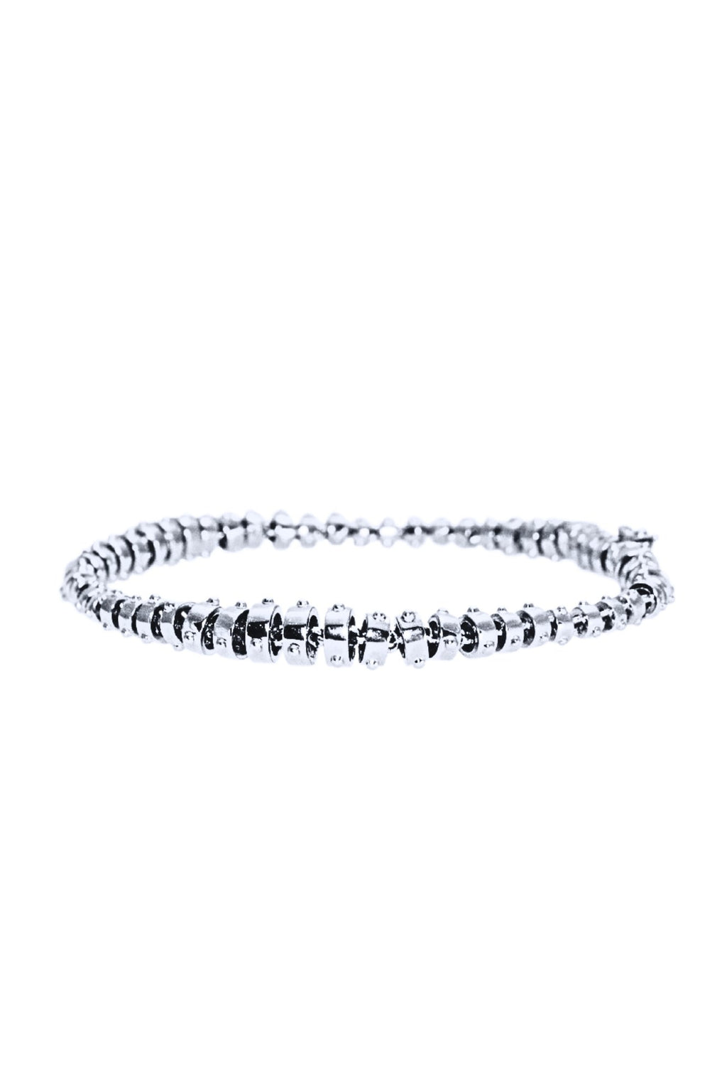 Jali Breeze Flexible Sleek Bracelet of 18k White Gold links, seamlessly transitioning in a gradient fashion, gradually widening and slimming down. Each link adorned with minimalist granulation, creating a sense of movement and fluidity, in a wavelike pattern twisting along the length of the bracelet.