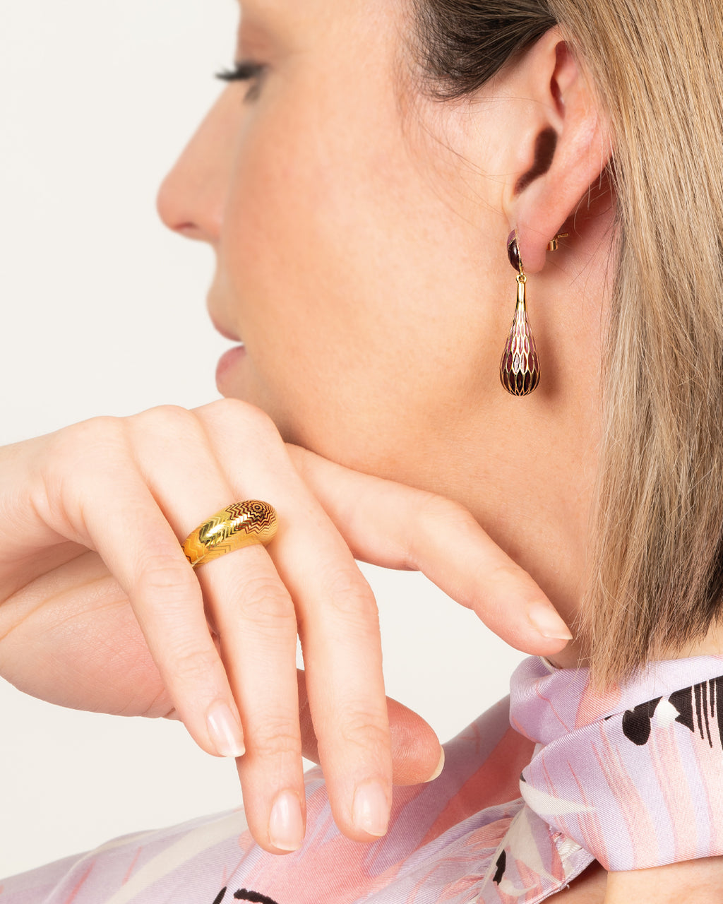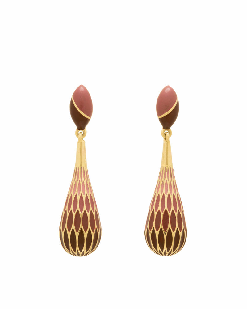 Baoli Flow 18k Yellow Gold Earring Lozenge Studs in two tone Pink Enamel with connected short drop pendant, the surface featuring petals decorated with graded shades of Pink enamels all around and down to the bottom.