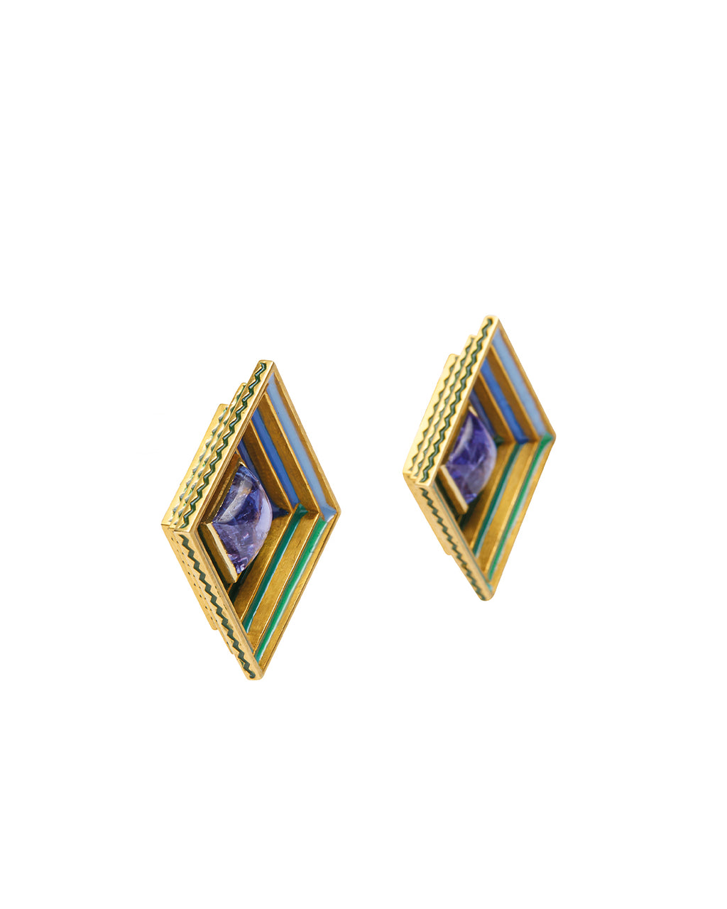 Baoli Well 18k Yellow Gold Square Earring Studs - Maxi- with stepped relief featuring graded shades of blue and green enamels, to a central Cabochon Tanzanite. The outer edges are embellished with a green enameled linear chevron pattern, reminiscent of rippling water.