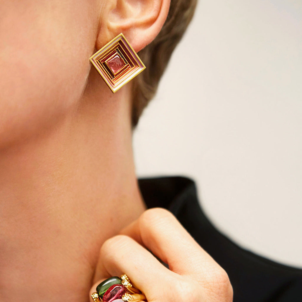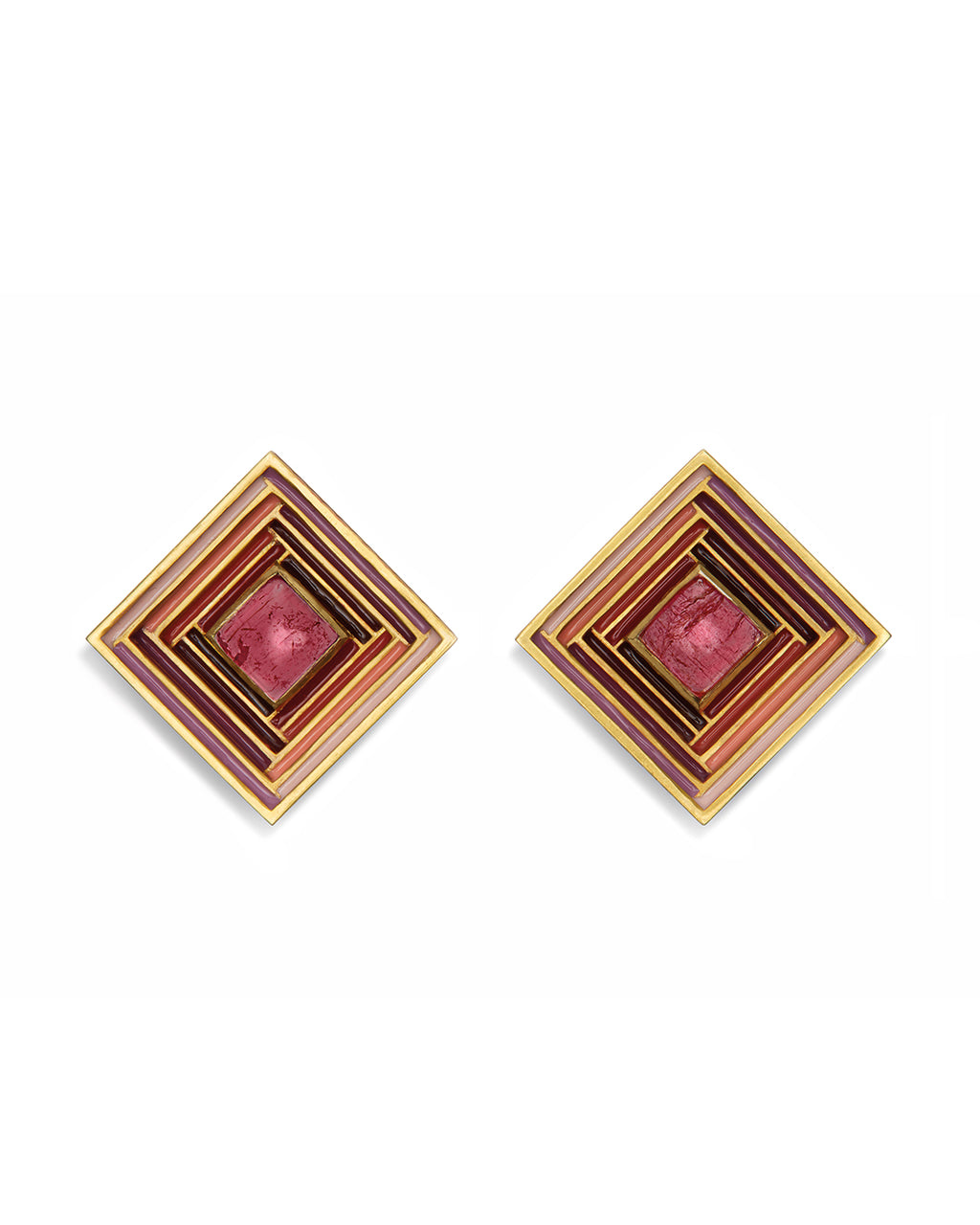 Baoli Well 18k Yellow Gold Square Earring Studs - Maxi- with stepped relief featuring graded shades of Red and Pink enamels, to a central Cabochon Pink Tourmaline. The outer edges are embellished with a Red enameled linear chevron pattern, reminiscent of rippling water.