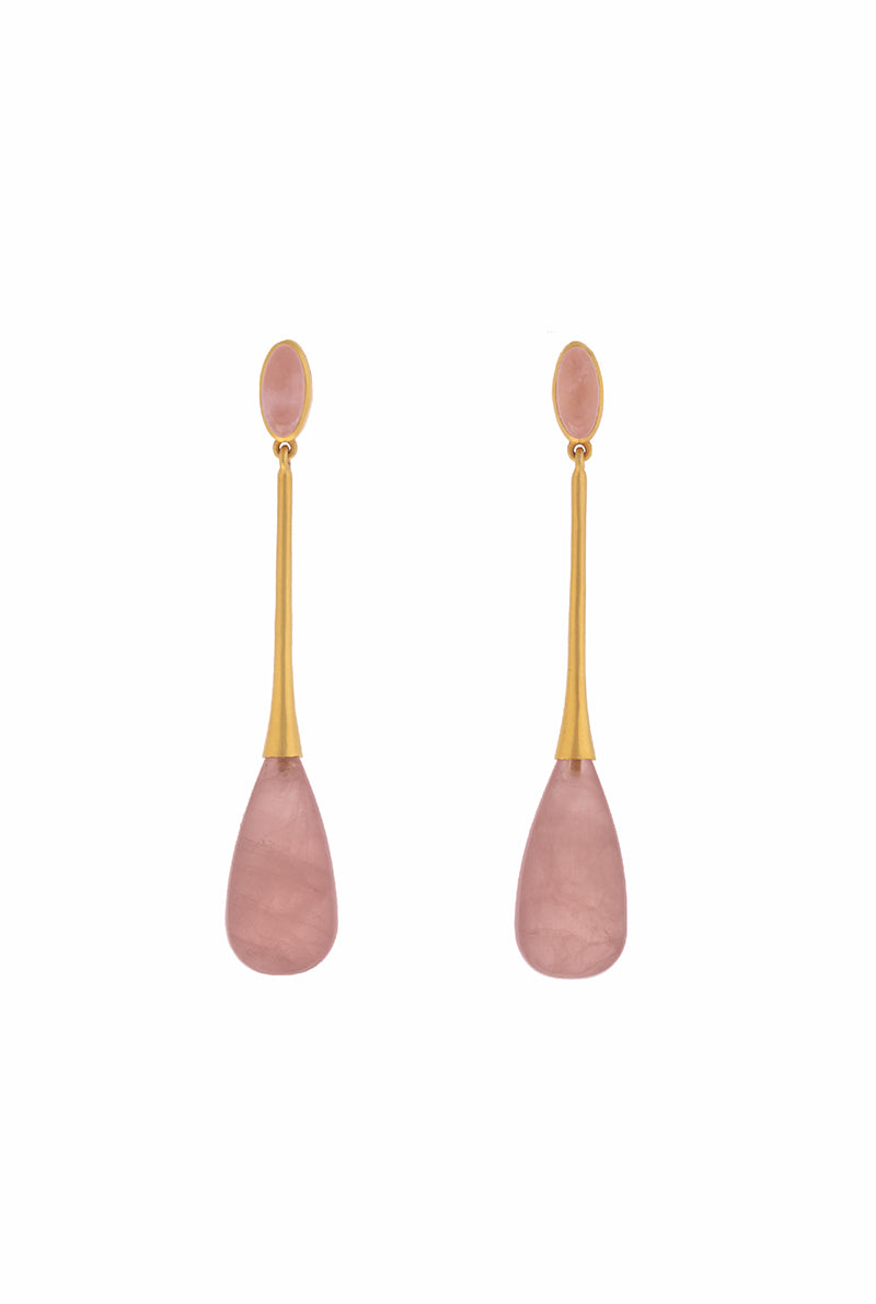 A pair of 18k yellow gold ear pendants with slim oval top, suspended pendant set with Rose Quartz drop