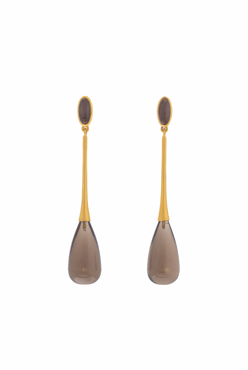A pair of 18k yellow gold ear pendants with slim oval top, suspended pendant set with Smokey Quartz drop