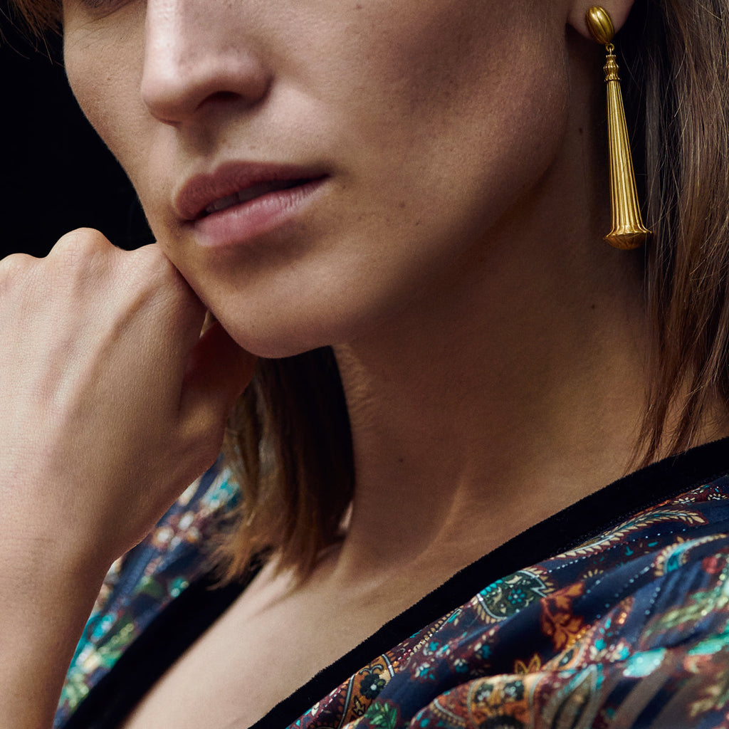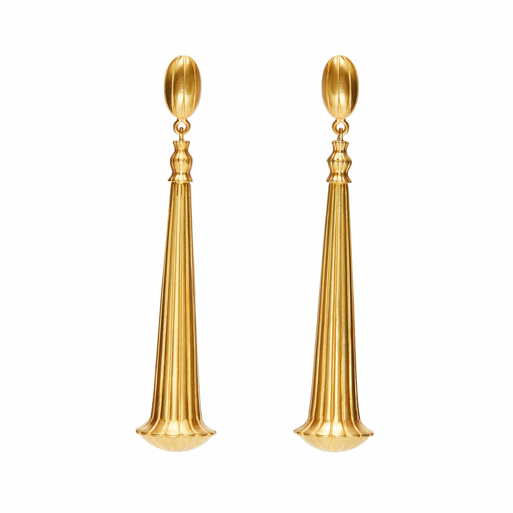 Jodha Bai Spirit18k Yellow Brushed Gold Earring Pendants featuring a Suspended Tapered Stem Adorned with Delicate Ribbed lining, and scalloped detail at bottom.