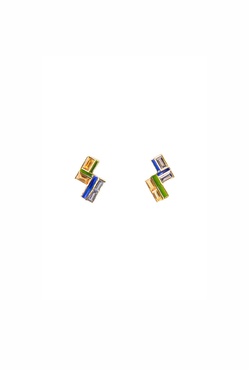Baoli Well 18k Yellow Gold Earring Studs -Mini- mismatched set with tablecut blue, green and yellow Sapphires, and Blue and Green enamelled details.