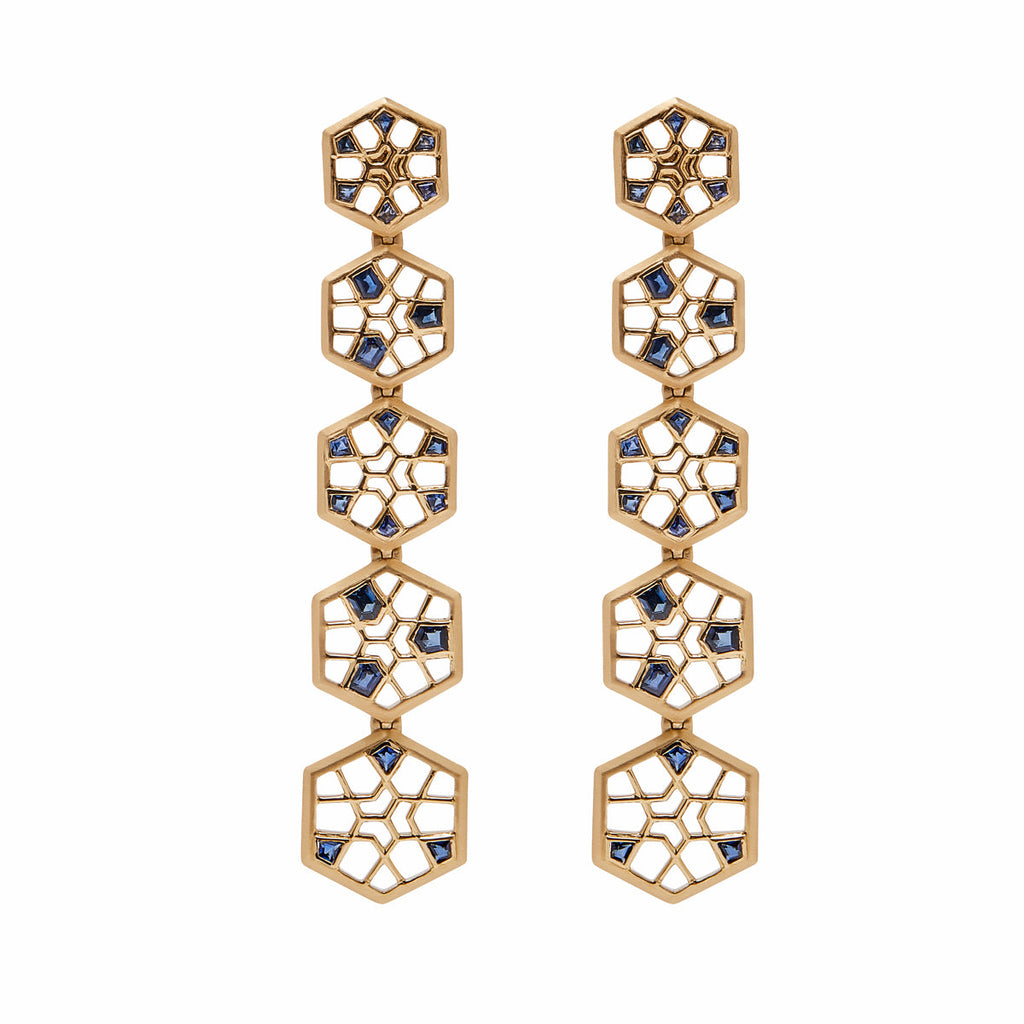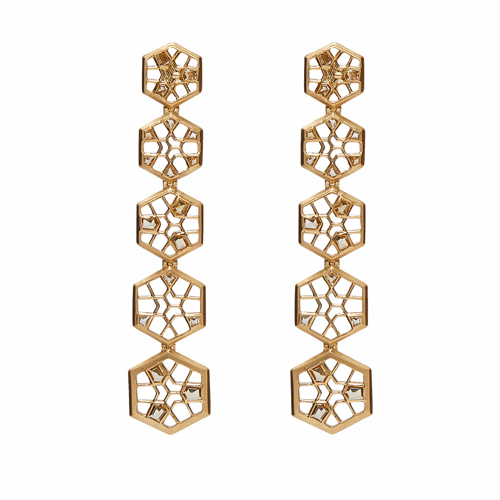 A Pair of 18K Brushed Yellow Gold Jali Divine Flexible Chandelier Earrings of five suspended and linked hexagon Jali motifs decorated with citrine.