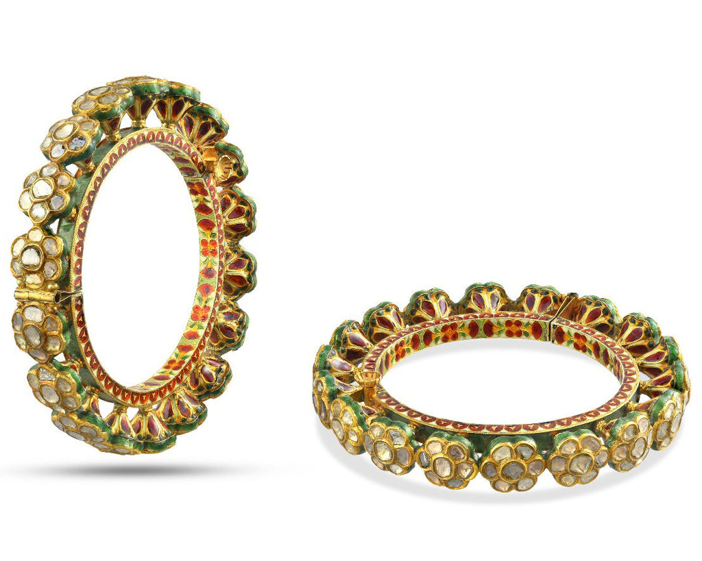 A pair of 23k gold bangles, kundan-set with natural diamonds in floral collets.