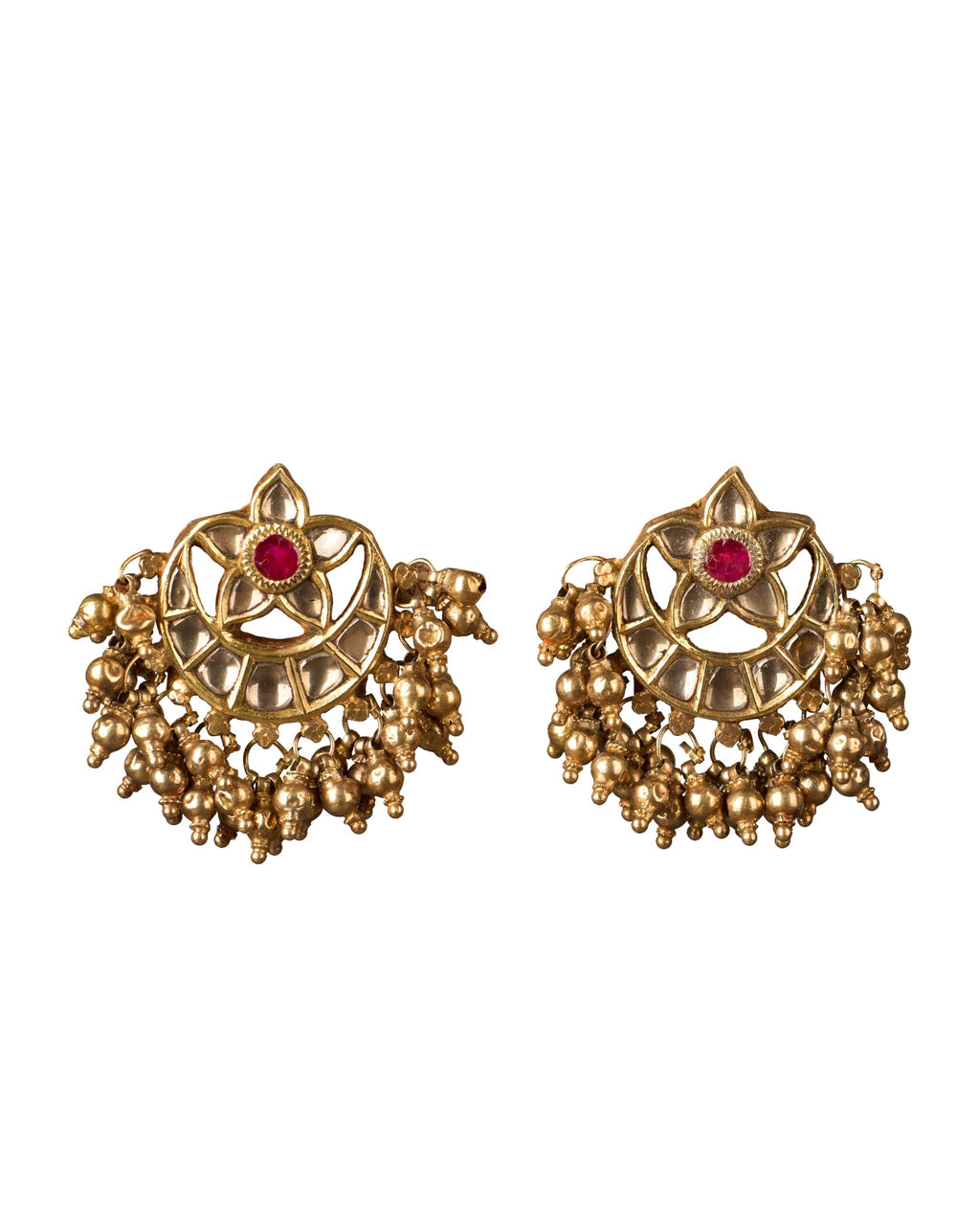 These antique 23-karat gold earrings from India reflect the timeless artistry of traditional Indian jewellery. The design features a floral motif set with a vibrant ruby at the centre, a gemstone long associated with royalty, vitality and protection.