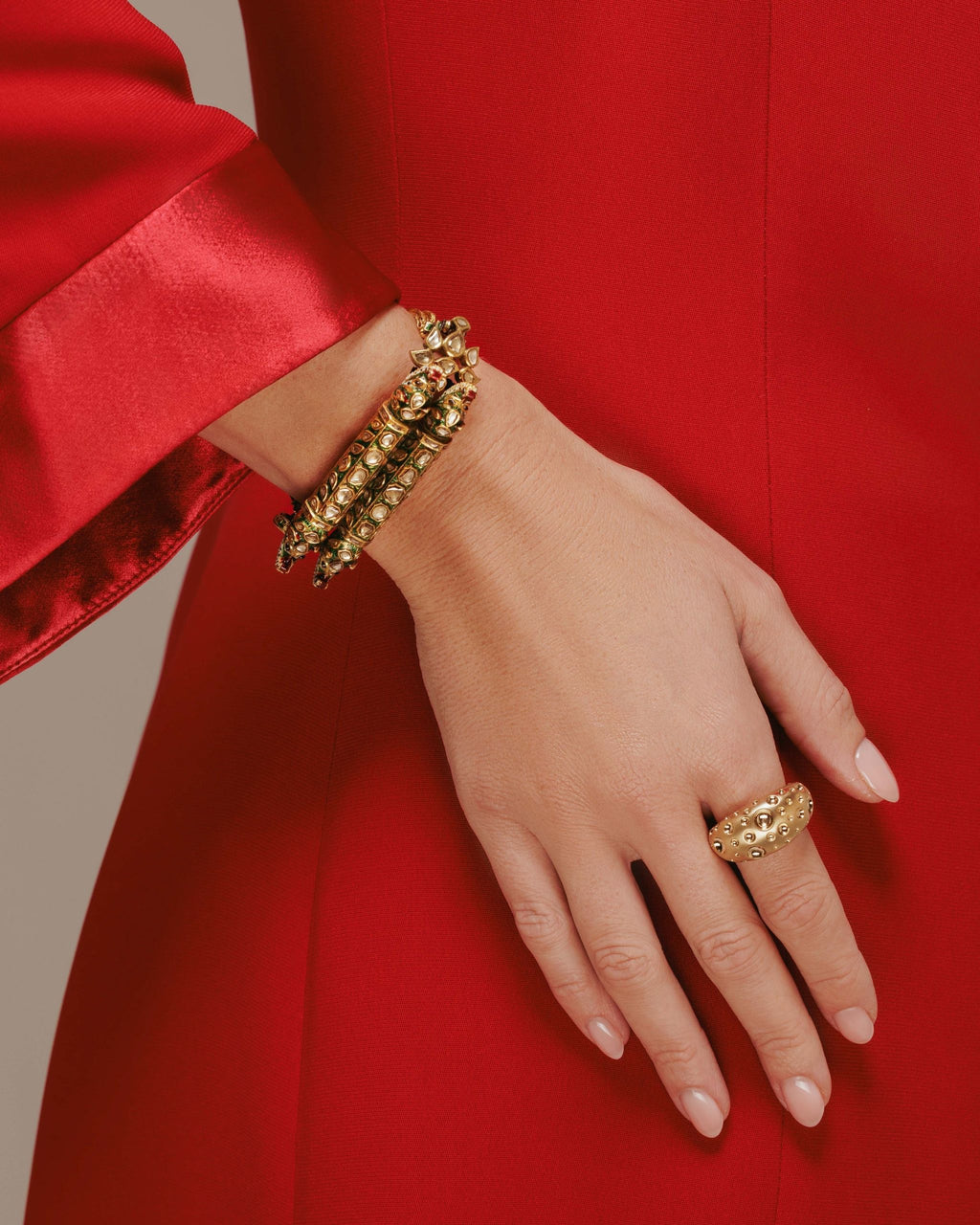 The Baju band, or upper arm bracelet, has its origins with the Mughals, who inherited the tradition from their Timurid ancestors. Originally worn as an amulet for protection in battle, it evolved into a symbol of royalty, strength, and refinement.