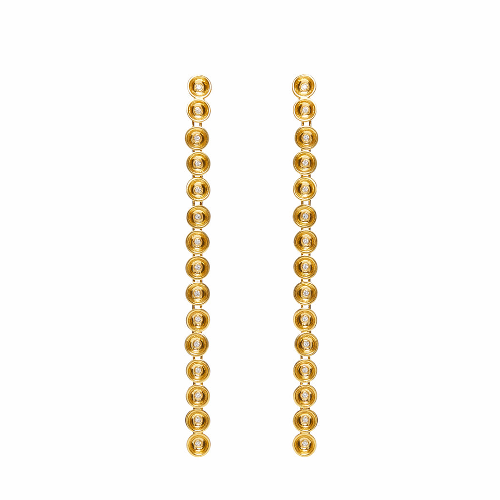 A pair of 18k gold long ear pendants consisting of 13 round, concave shaped segments, intricately linked at the reverse. Each round concave segment is set with a single diamond in a central delicate round collet.