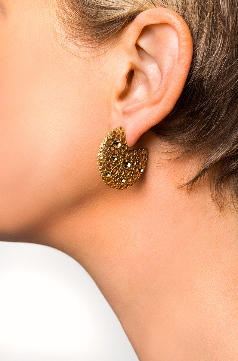 Pair of Jali Celestial Domed Earring Hoops of distinctive 18k Yellow Gold open or concave roundels, the concave bases boast a high-polished, mirror-like finish, contrasting against the overall brushed gold finish.