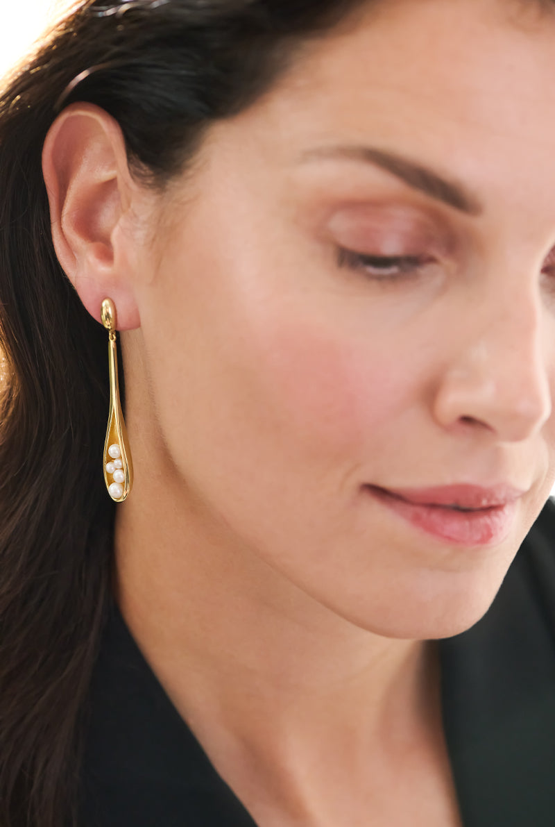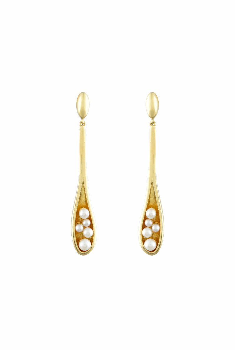 Jodha Bai Spirit 18k Yellow Gold Ear Pendants of Oval Top and Suspended Concave Drop Pendant set with Pearls