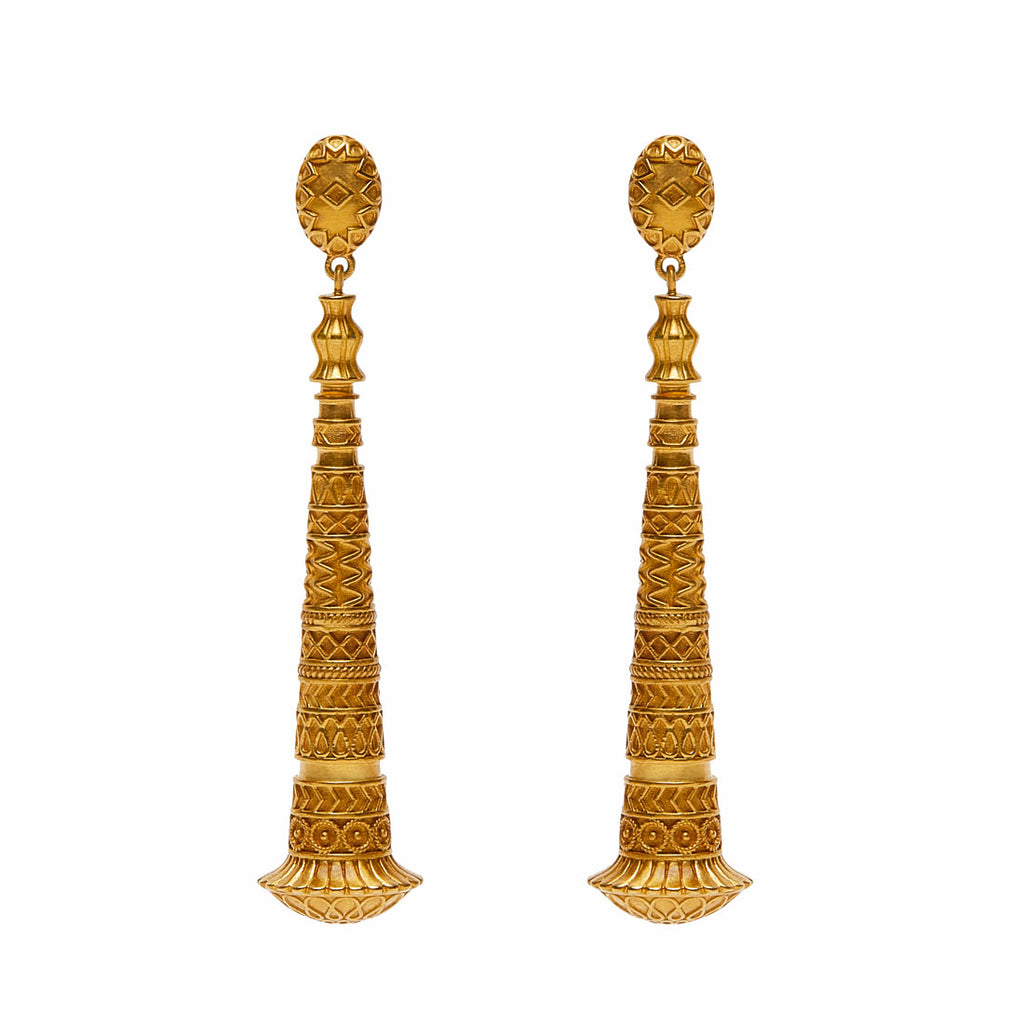 Jodha Bai Spirit18k Yellow Gold Earring Pendants featuring a Suspended Tapered Stem Adorned with Delicate Filigree, Twisted Wire, and Engraved Linear Patterns, The Bottom is Decorated with a Carved Stylized Floral Motif.