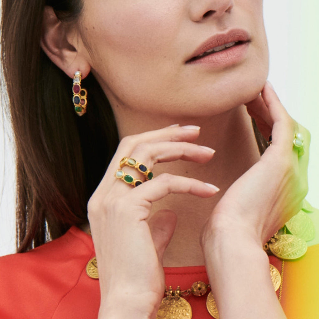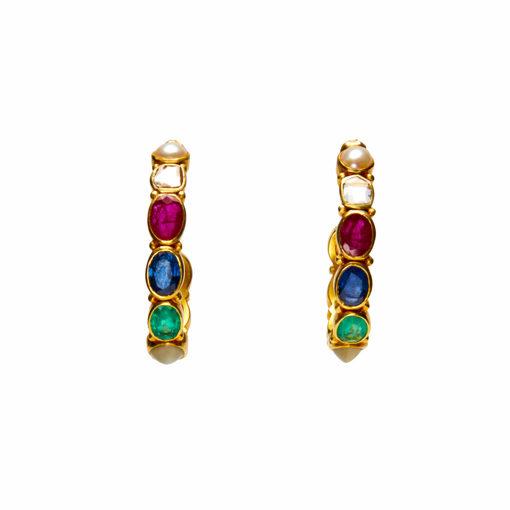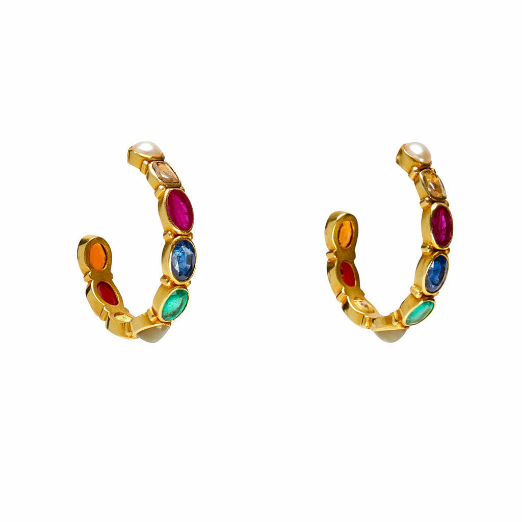 Navaratna Planets 18k Yellow Gold Hoop Earrings - Maxi, set with nine gems: Ruby, Pearl, Coral, Emerald, Topaz, Diamond, Sapphire, Zircon, Cat's Eye, in oval open collets.