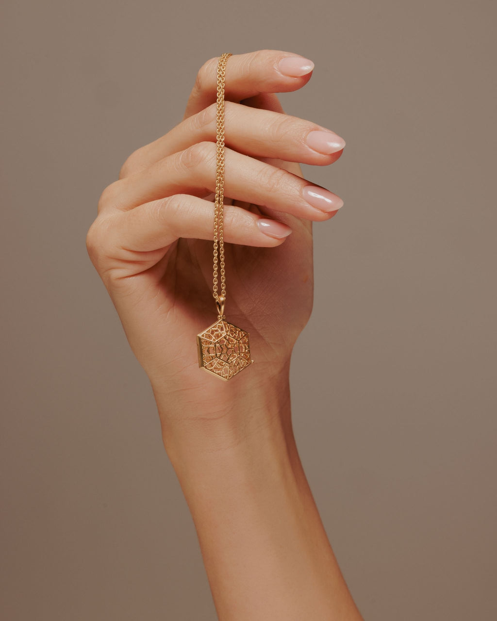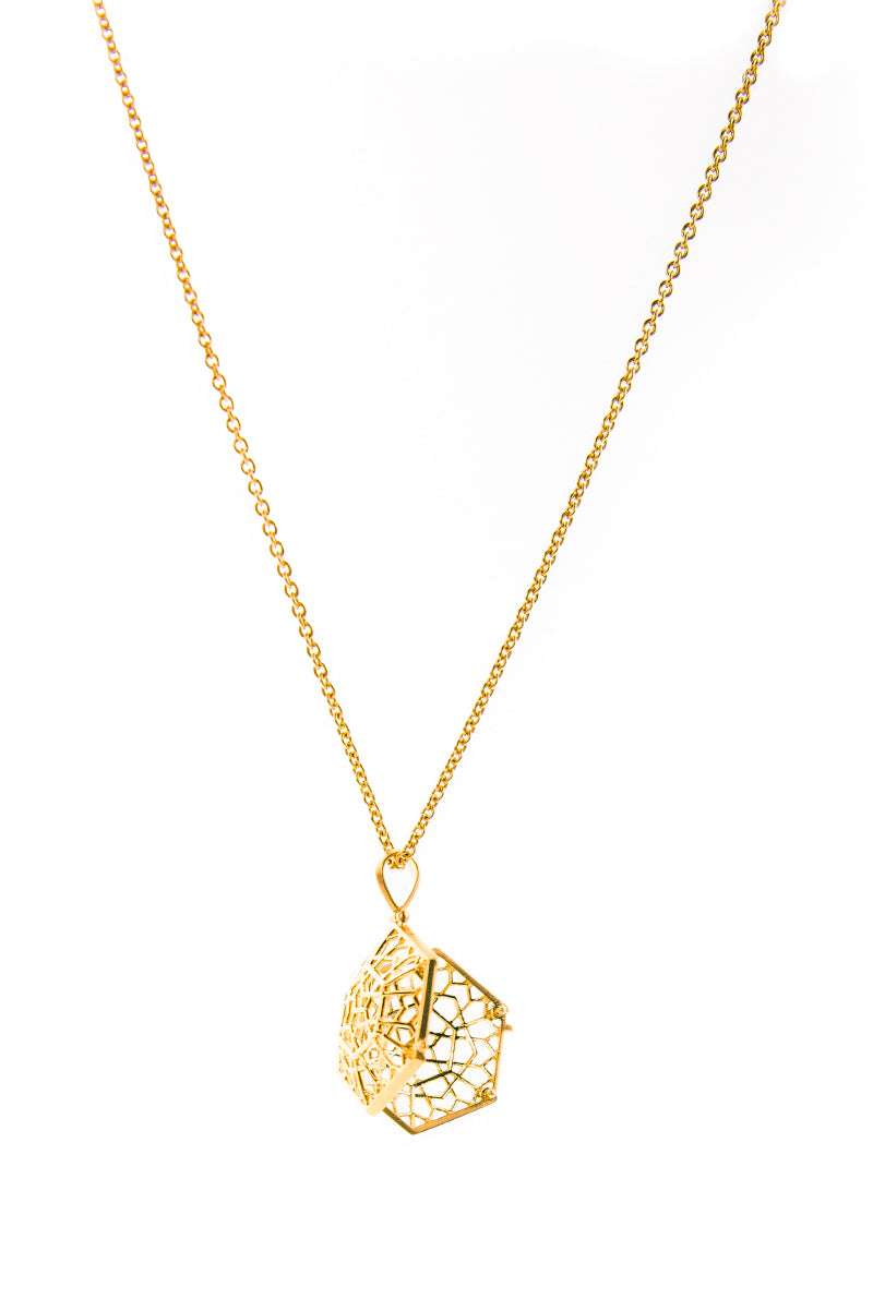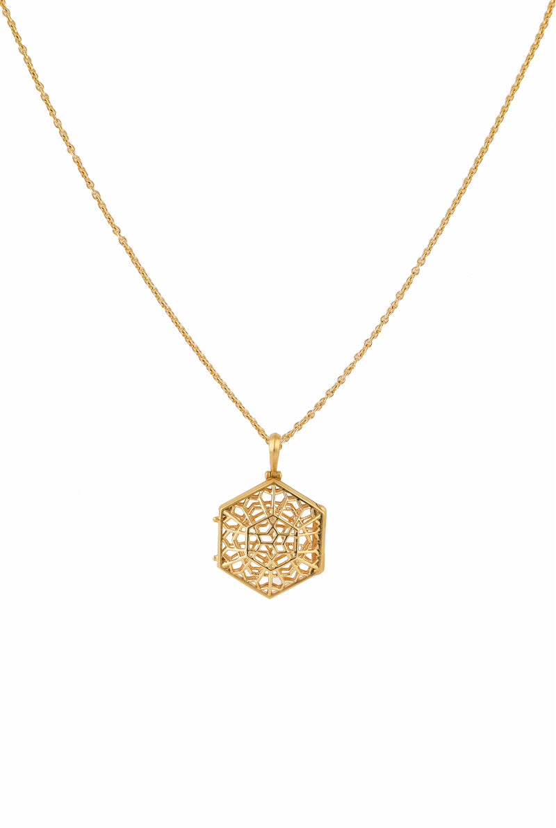 Jali Divine Hexagonal 18k Yellow Gold Locket Pendant with intricate Hexagonal Jali motif, hung from 18k gold linked chain.