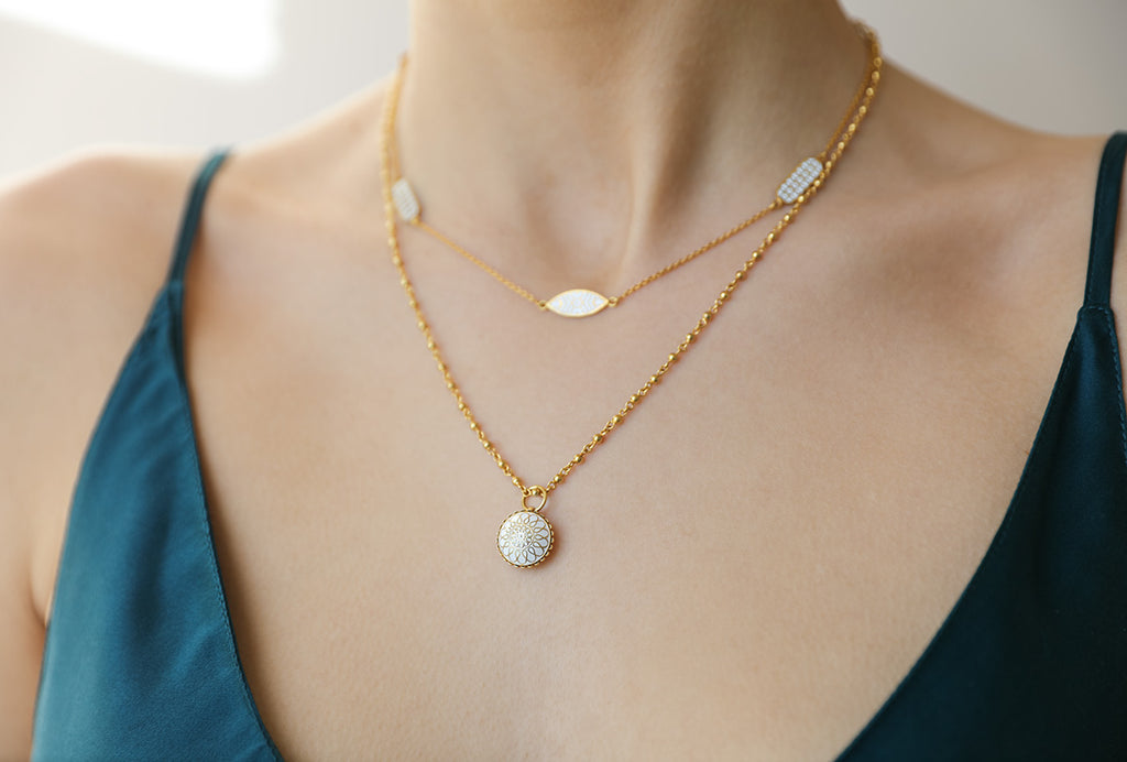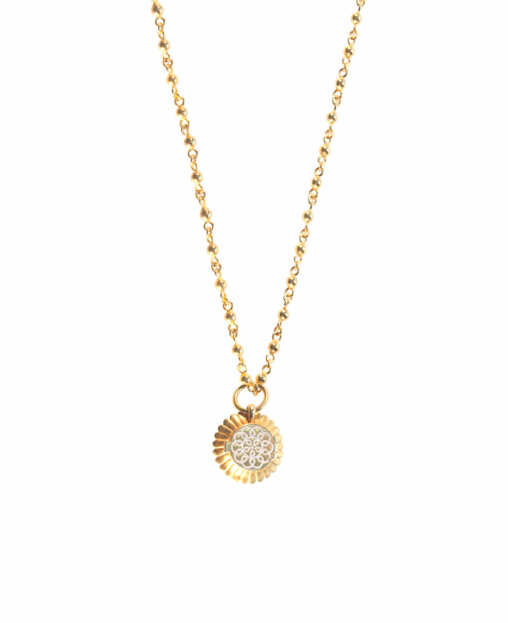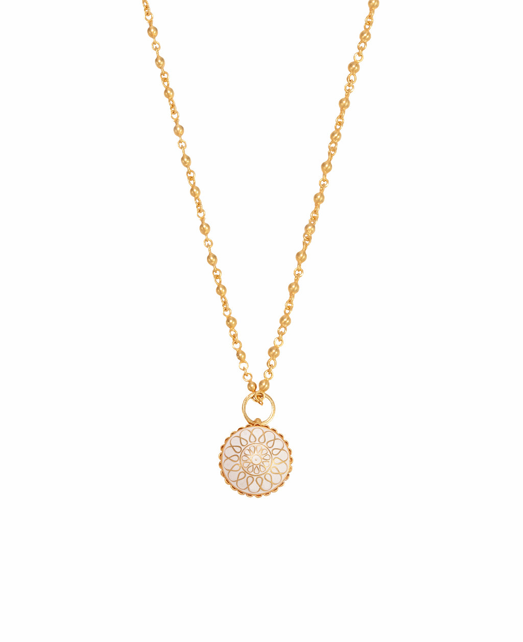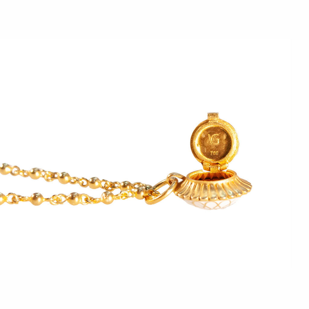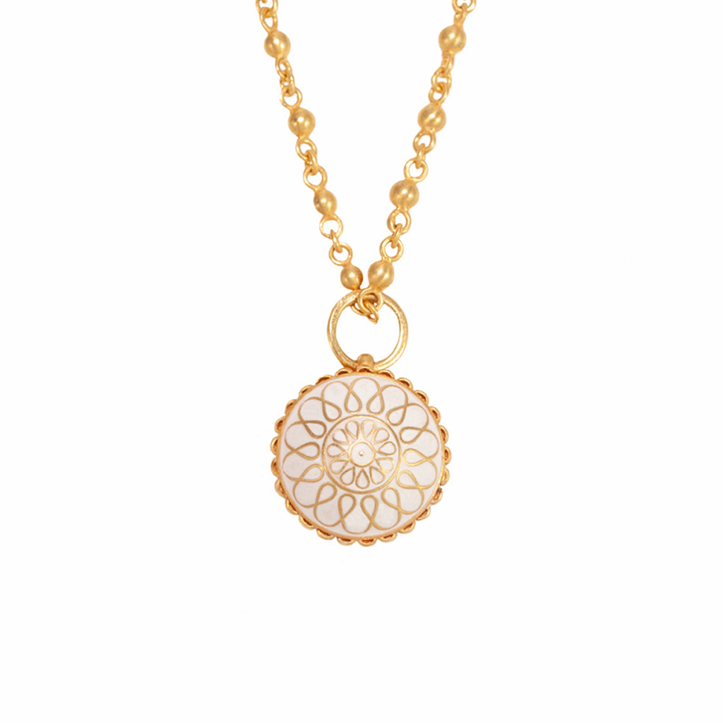 Jodha Bai Meenha 18k Yellow Gold Pendant Locket with a delicate gold linear pattern on a white enameled ground, with scalloped edge and white enamel linear pattern on the reverse, hung from an 18k Yellow Gold decorative linked chain necklace.