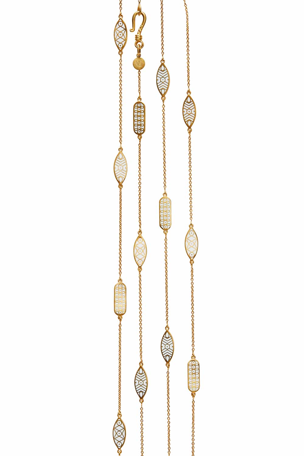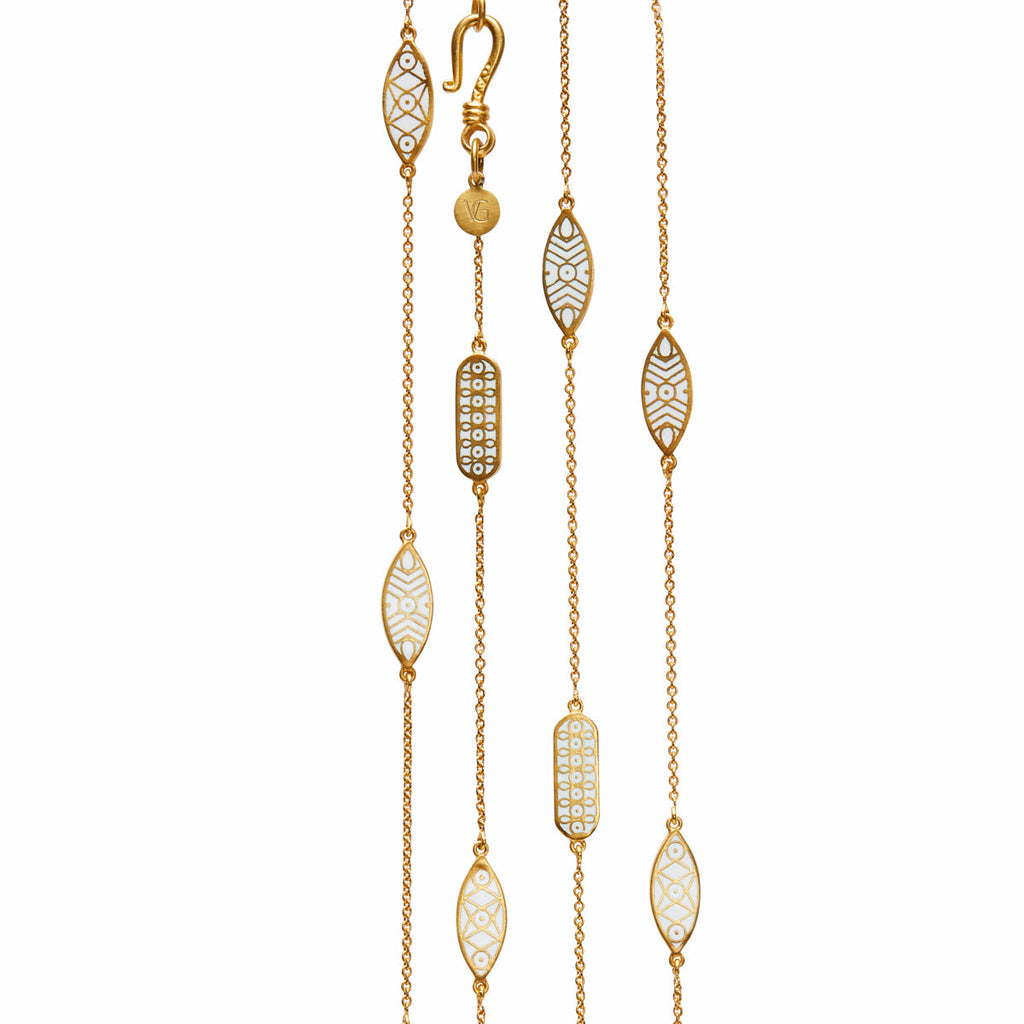 Jodha Bai Meenah18k Yellow Gold Chain Necklace, with shield-like rounded vertical and lozenge spacers featuring delicate gold linear pattern on white enamel ground.