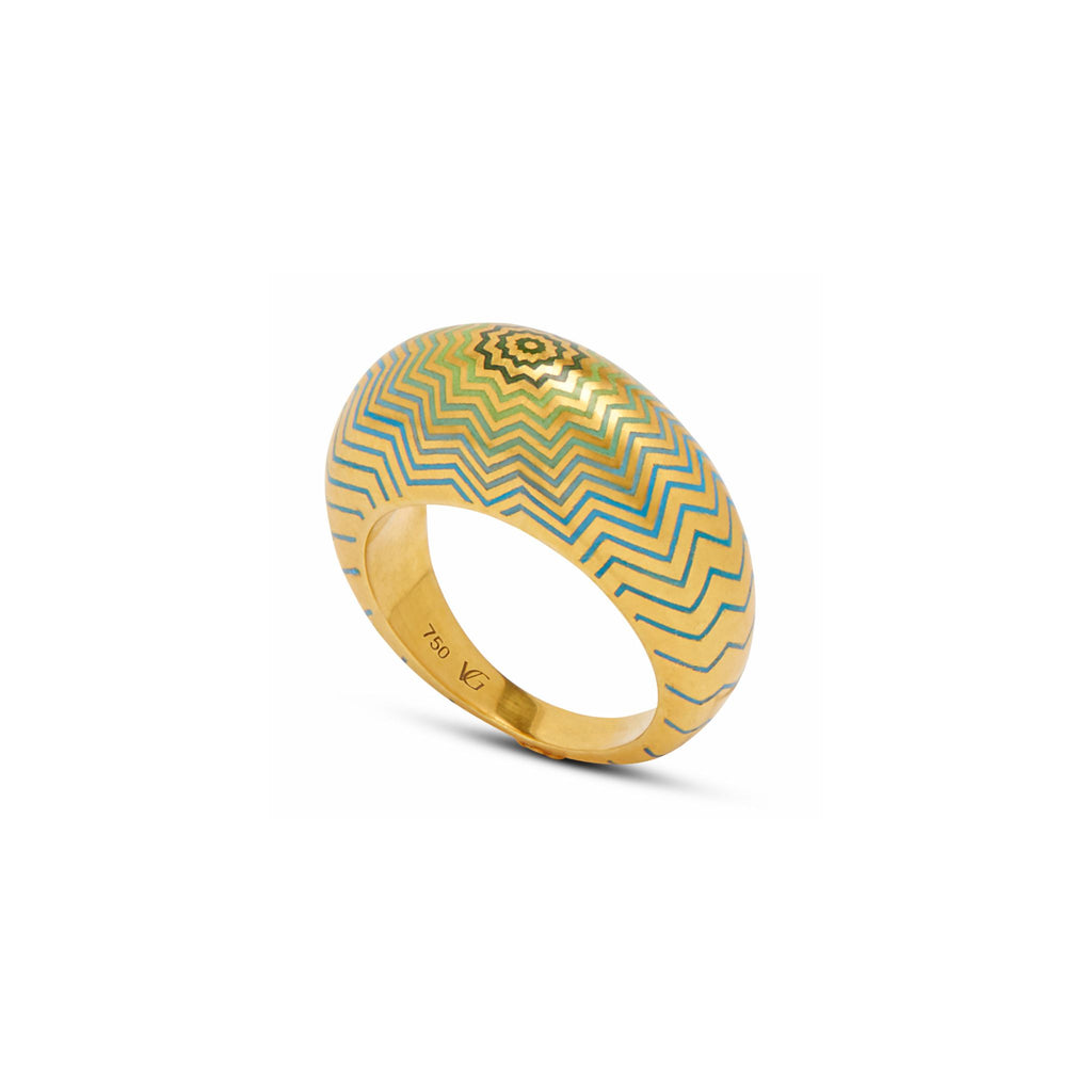 Baoli Flow 18k Yellow Gold Bombé Ring - Slim - the surface featuring graded shades of Green enamels down to the band.
