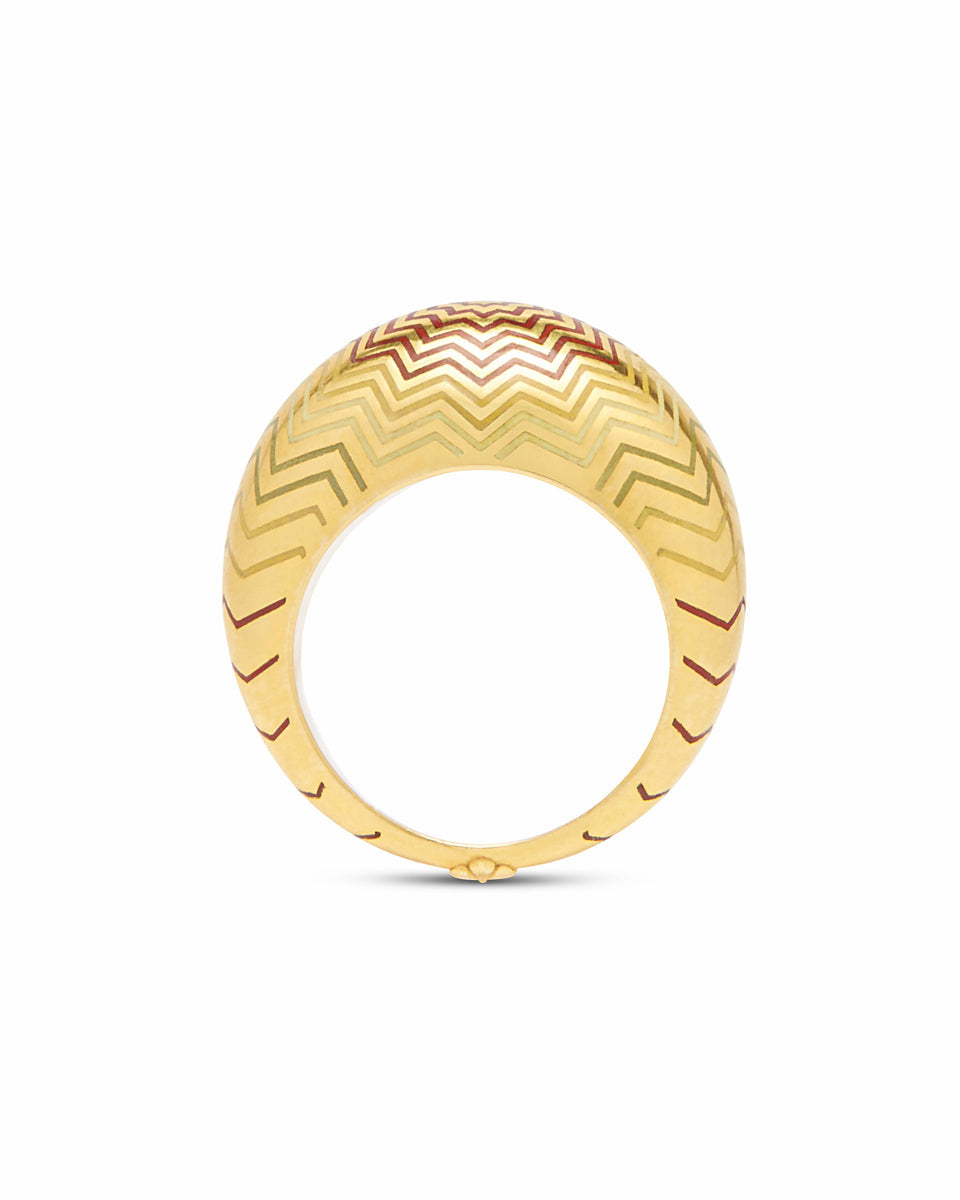 Baoli Flow 18k Yellow Gold Bombé Ring - Slim - the surface featuring graded shades of Green enamels down to the band.