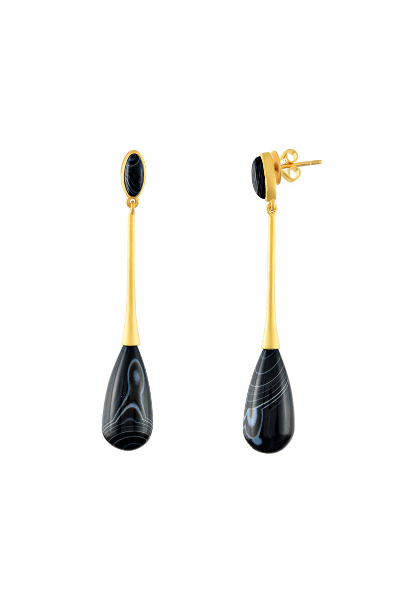 A pair of 18k yellow gold ear pendants with slim oval top, suspended pendant set with Black Banded Agate drop