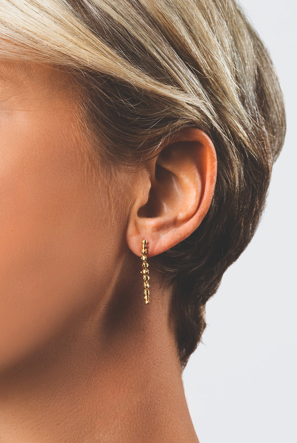 Jali Breeze Flexible Sleek Earrings of 18k Brushed Yellow Gold links, seamlessly transitioning in a gradient fashion, gradually widening and slimming down. Each link adorned with minimalist granulation, creating a sense of movement and fluidity, in a wavelike pattern twisting along the length of the earring.