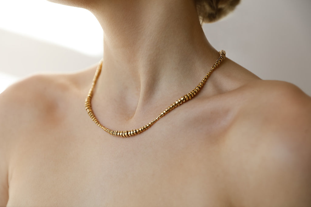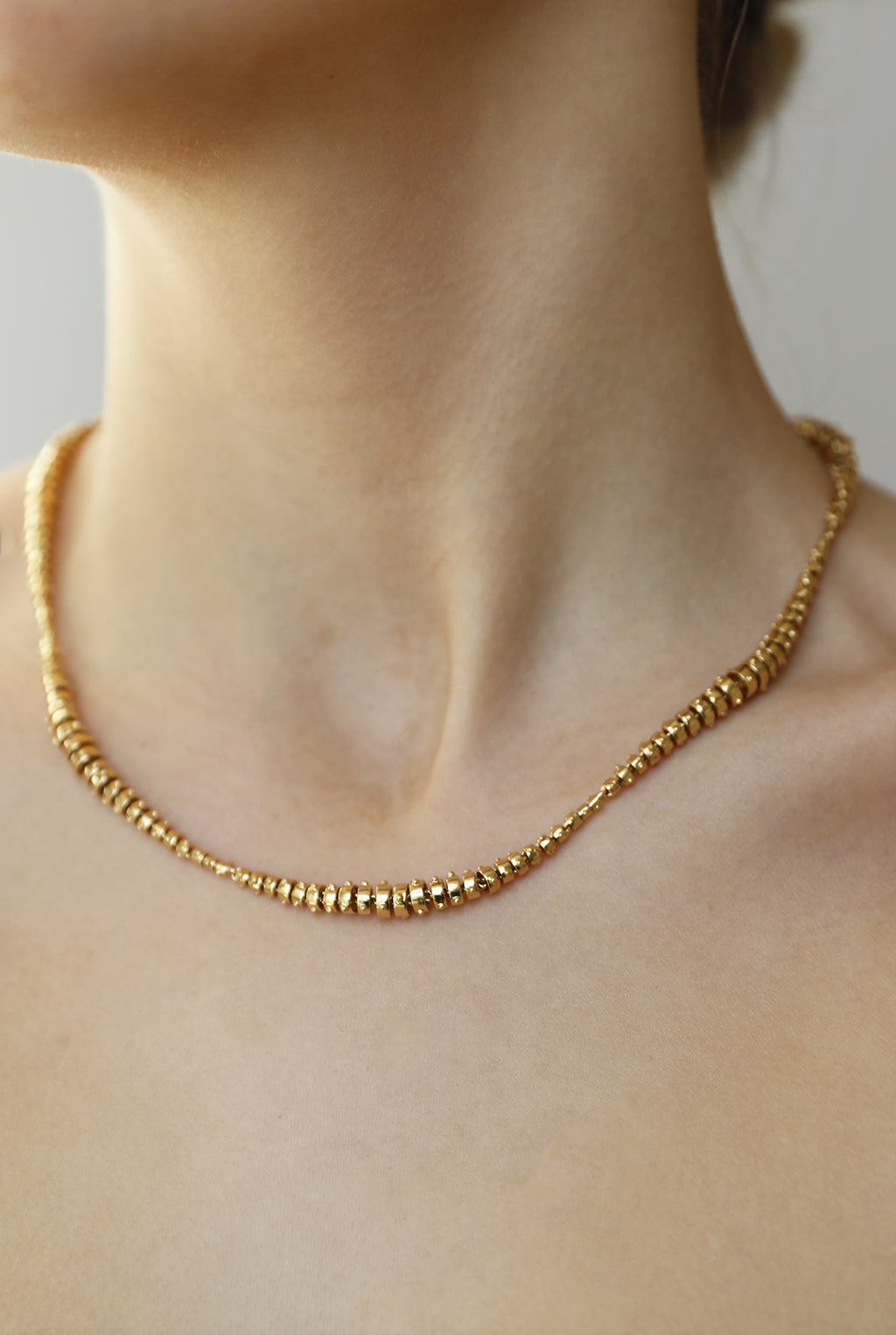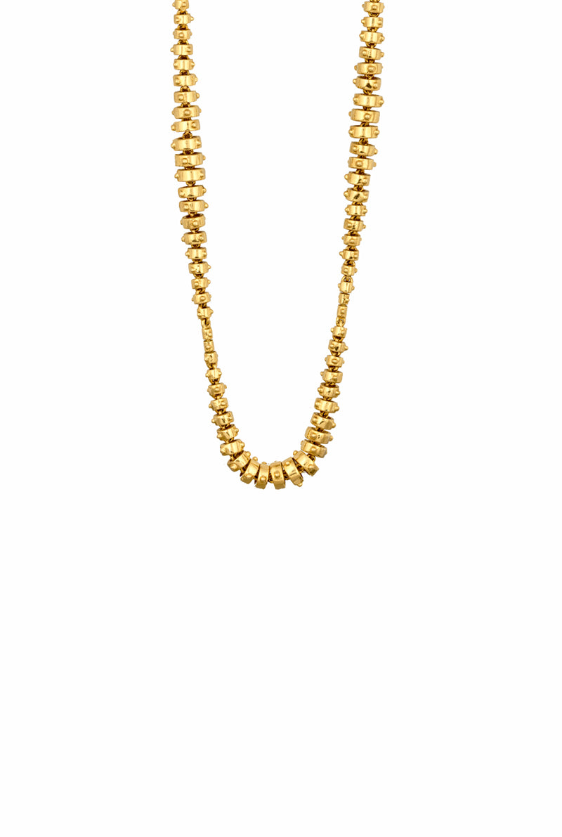 Jali Breeze Chain Necklace of 18k Yellow Gold links, seamlessly transitioning in a gradient fashion, gradually widening and slimming down. Each link adorned with minimalist granulation, creating a sense of movement and fluidity, in a wavelike pattern twisting along the chain.
