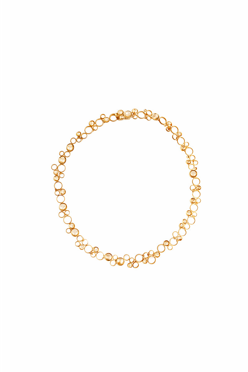 Jali Celestial Classic Collar Necklace of distinctive 18k Yellow Gold open or concave roundels, the concave bases boast a high-polished, mirror-like finish, contrasting against the overall brushed gold finish.