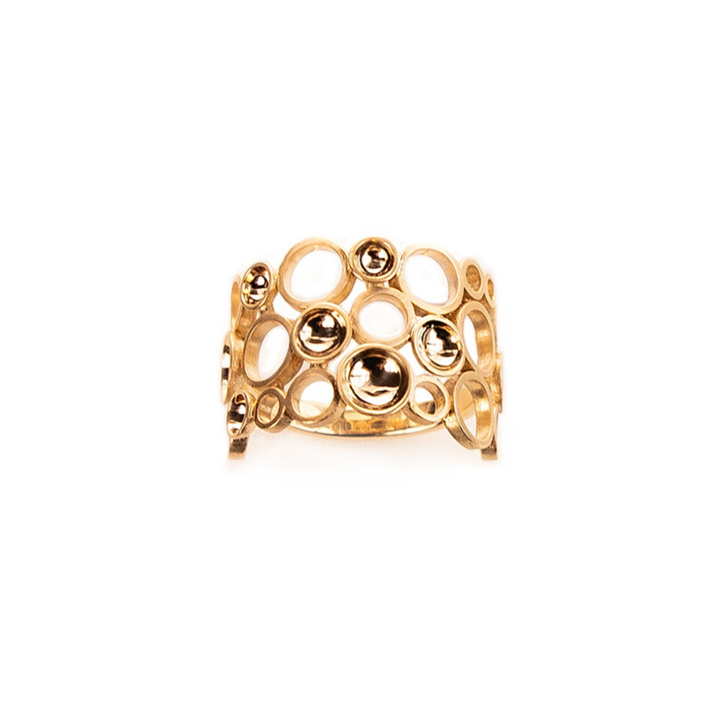 Jali Celestial Halfround Ring with wide pattern of distinctive 18k Yellow Gold open or concave roundels, the concave bases boast a high-polished, mirror-like finish, contrasting against the overall brushed gold finish, on high polished ring band.
