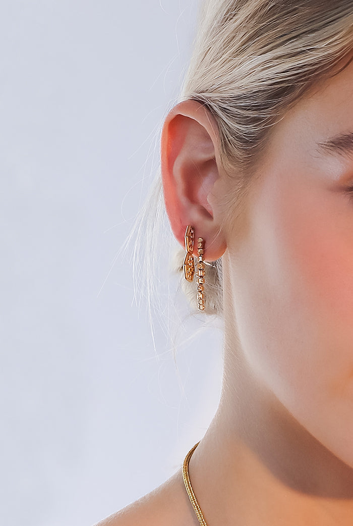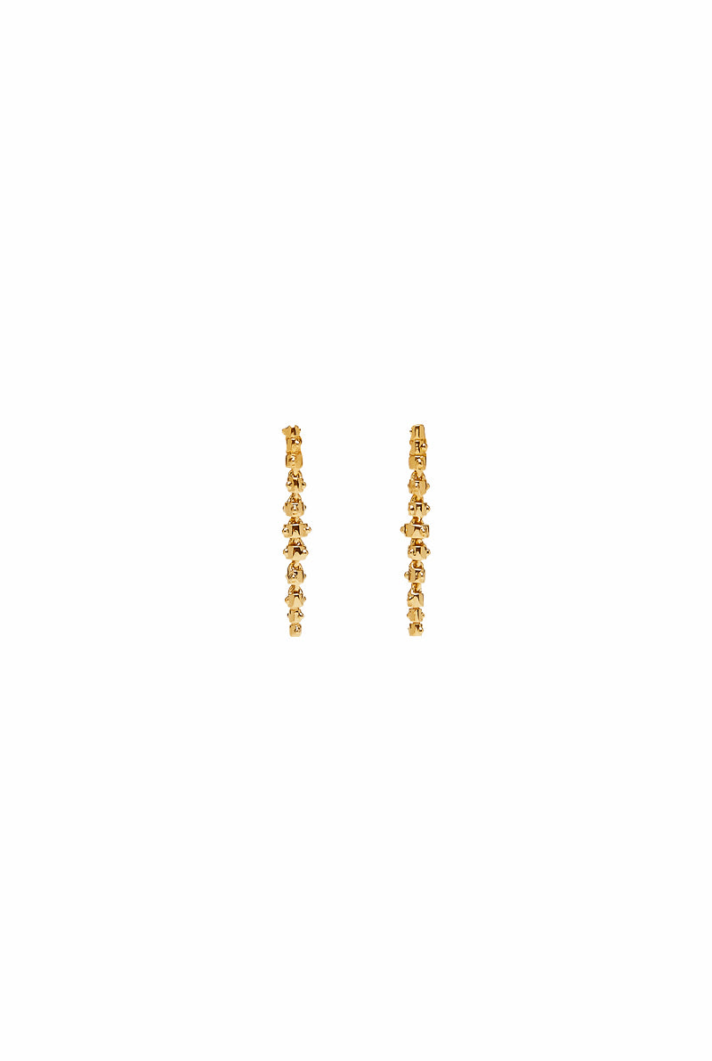 Jali Breeze Flexible Sleek Earrings of 18k Brushed Yellow Gold links, seamlessly transitioning in a gradient fashion, gradually widening and slimming down. Each link adorned with minimalist granulation, creating a sense of movement and fluidity, in a wavelike pattern twisting along the length of the earring.