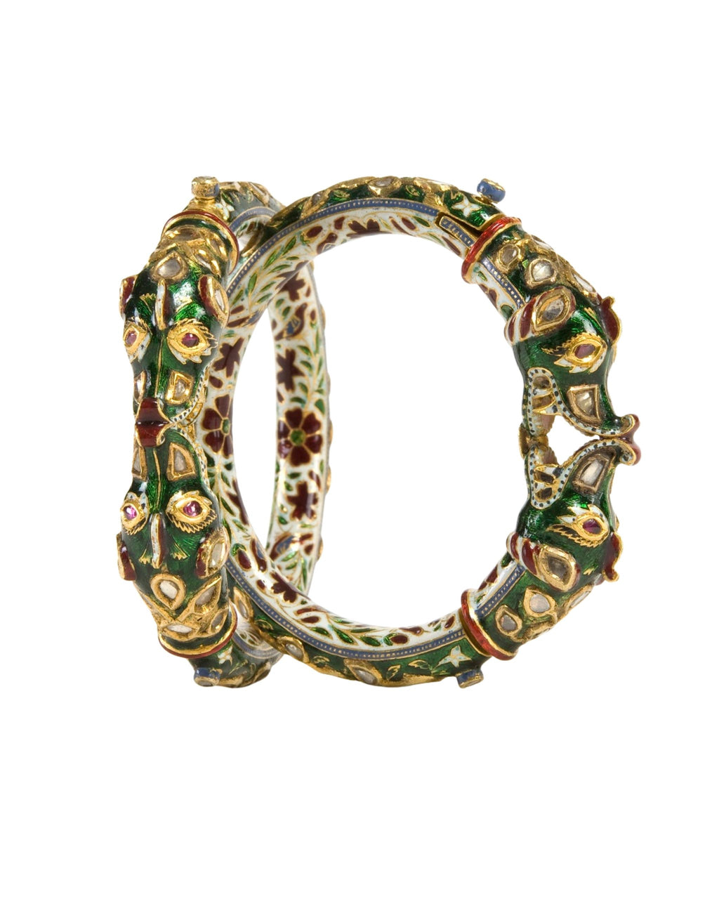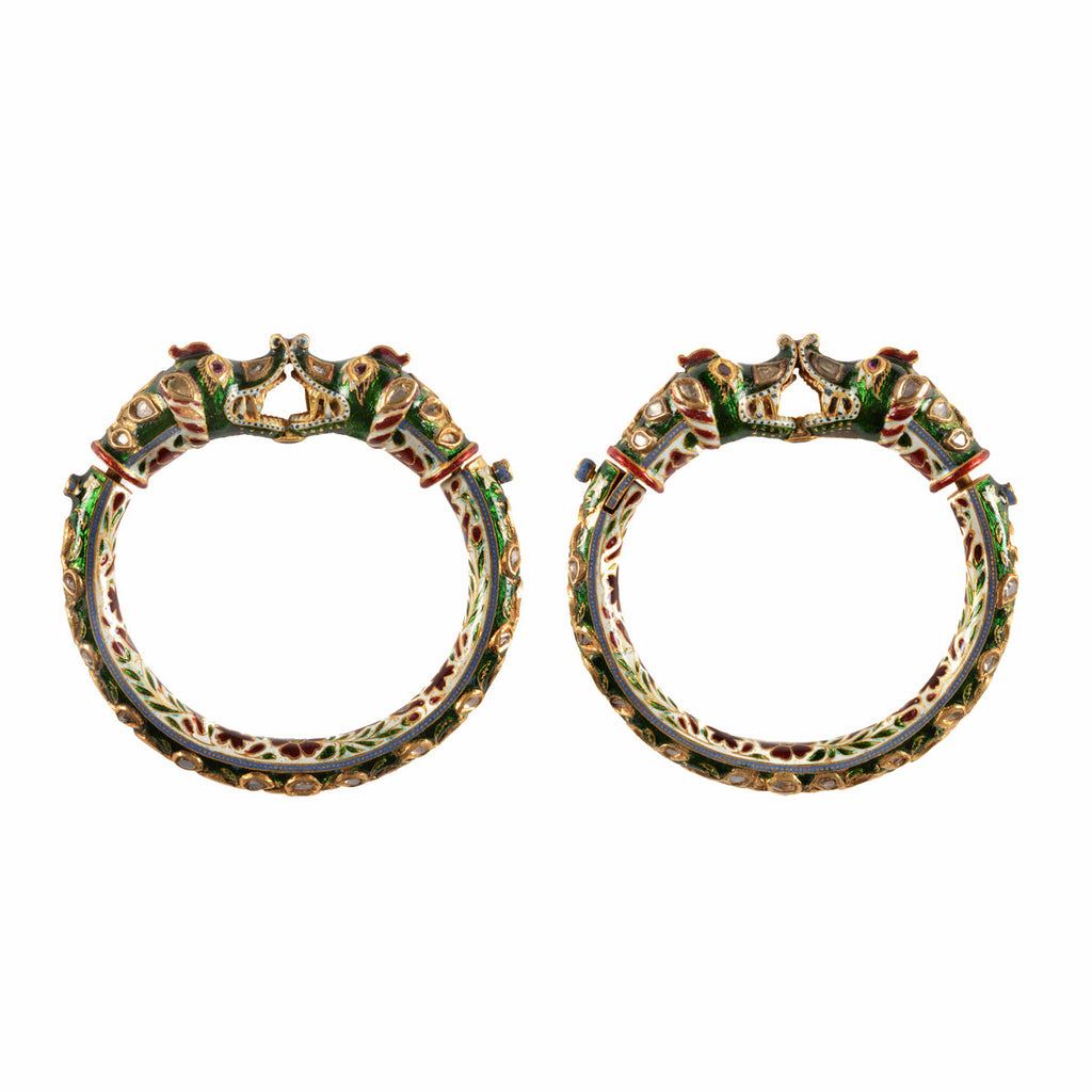 A pair of gold child bangles BAL KADAS, with Makara (mythical sea creature) head finials, set with diamonds and rubies and enamelled in the traditional Champlevé technique, with a scroll of red flowers and green leafs on a white ground, with red and green parrots all executed in safed chalwan enamel, the outside with green enamel, kachnar ki patti. The use of red enamel work is only possible on 20k or higher pure gold.