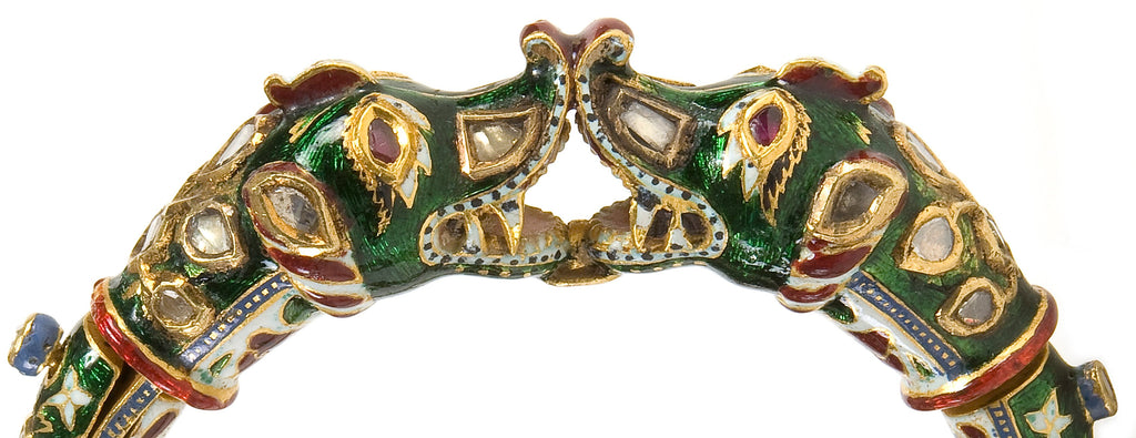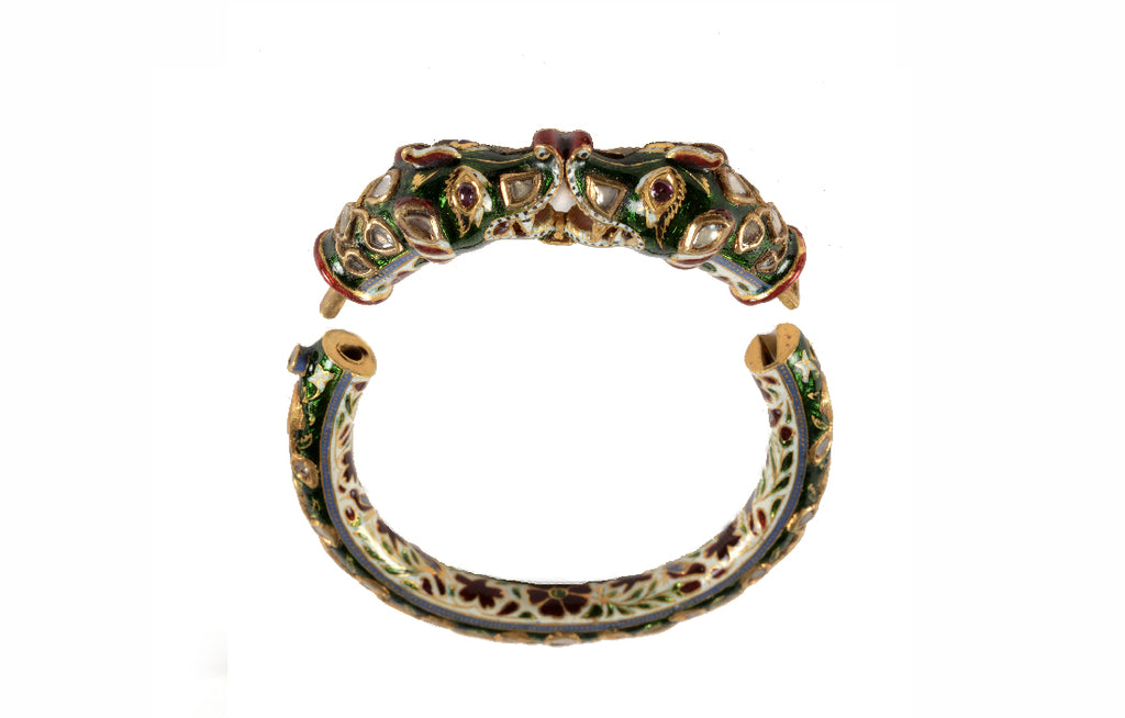 The presentation of bangles to a newborn baby was a tradition, which originated in Rajasthan, the home of the Rajputs – the purpose being to bless and ward off the evil eye. This tradition stems from the initial practice of adorning a newborn baby with a black thread on both wrists and for this reason these bangles were enamelled in dark blue and even black. Bal Kadas were presented in a ceremony called Bhath, and were brought by the maternal uncle of the child. The rich execution and lavish embellishments on these Bal Kadas, Bal meaning child and Kadas meaning bangles, reveal the privileged status of the owner.