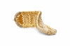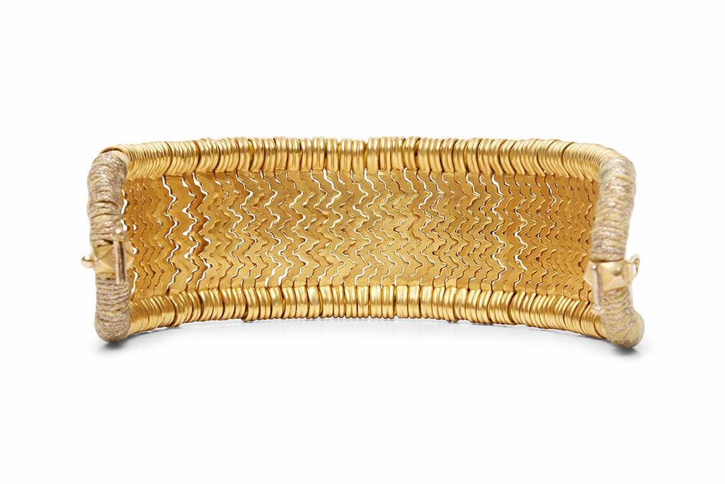 A gold flexible armlet, baju band. The baju band has narrow interlocking vertical gold units, and are joined with a thick rope of cotton threads on either side.