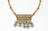 A traditional gold wedding ornament, NIMBOLI PANCH MANIA, (five gems), consisting of a rectangular pendant, with five rosettes, kundan set with foiled rock crystal, rimmed with small pearls, and suspended a fringe of gold collets, kundan set with foiled rock crystal, emerald beads, pearls and green enamelled beads. Hung from a heavy gold chain embellished with gold rosettes